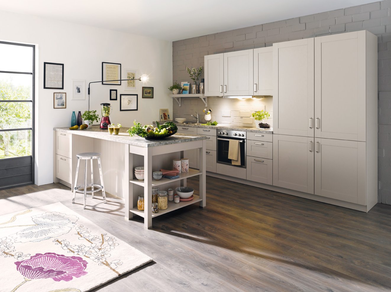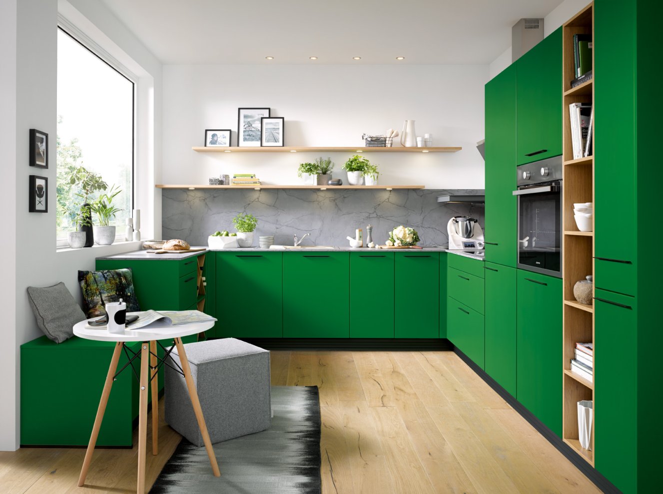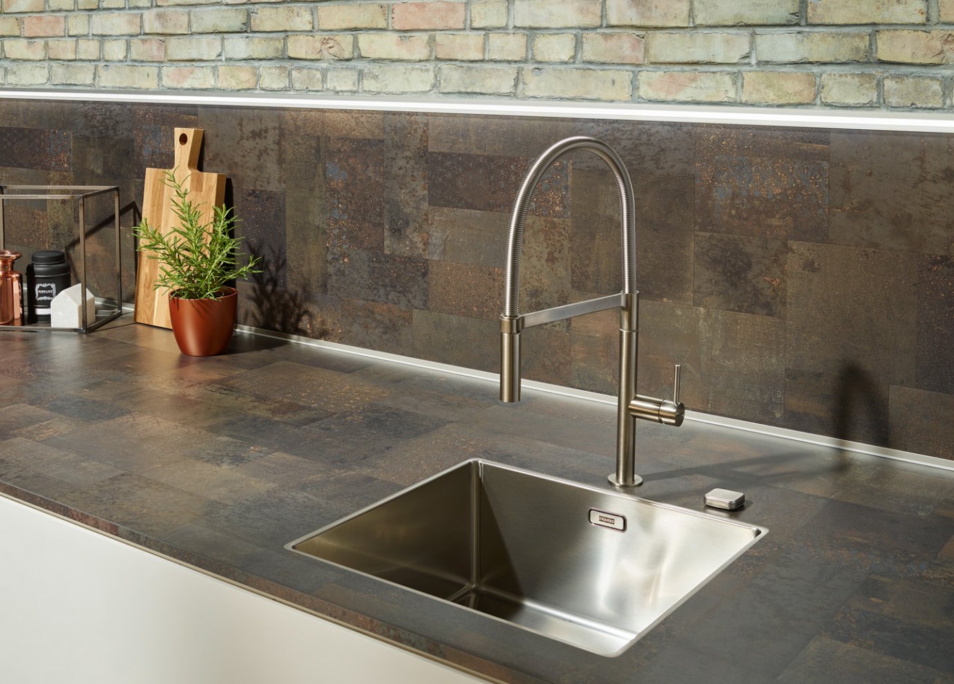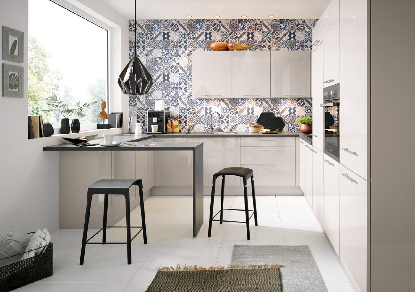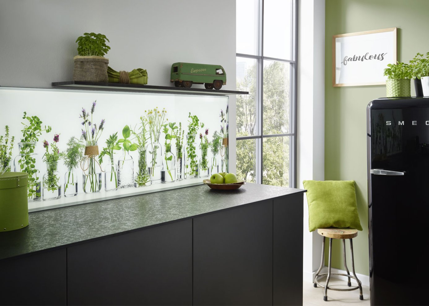 Sie ist ein Eyecatcher, der zudem vielfältige Aufgaben erfüllt: die Küchennische, der Raum zwischen der Arbeitsplatte und den Hängeschränken. Sie dient als attraktive Stellfläche für ausgewählte Lieblingsgegenstände des Küchenalltags – z. B. einen dekorativen Espressoautomaten oder Smoothie Maker. Selbstverständlich wird auch heute noch in vielen Küchen der Bereich zwischen Arbeitsplatte und Hängeschränke gefliest. Dabei wählt man allerdings eher Fliesen im großen Format, was vor allem den Vorteil hat, dass weniger Fugen entstehen und der Bereich leichter zu reinigen ist. Außerdem spricht nichts dagegen die Nische mit Stein, Mineralwerkstoff, Keramik, Tapeten oder Wandtattoos zu gestalten. Auch hier gilt wieder : Erlaubt ist was gefällt!