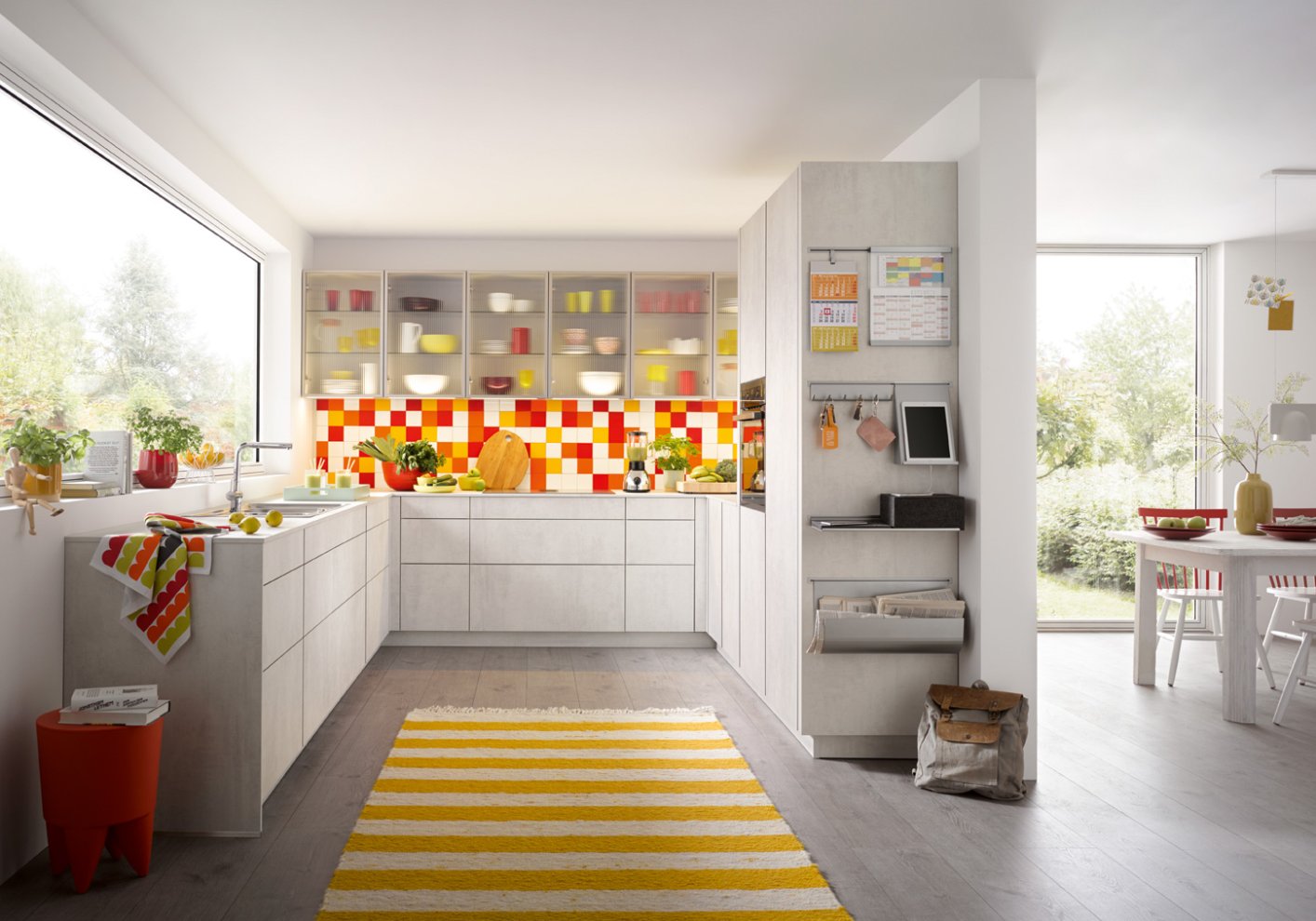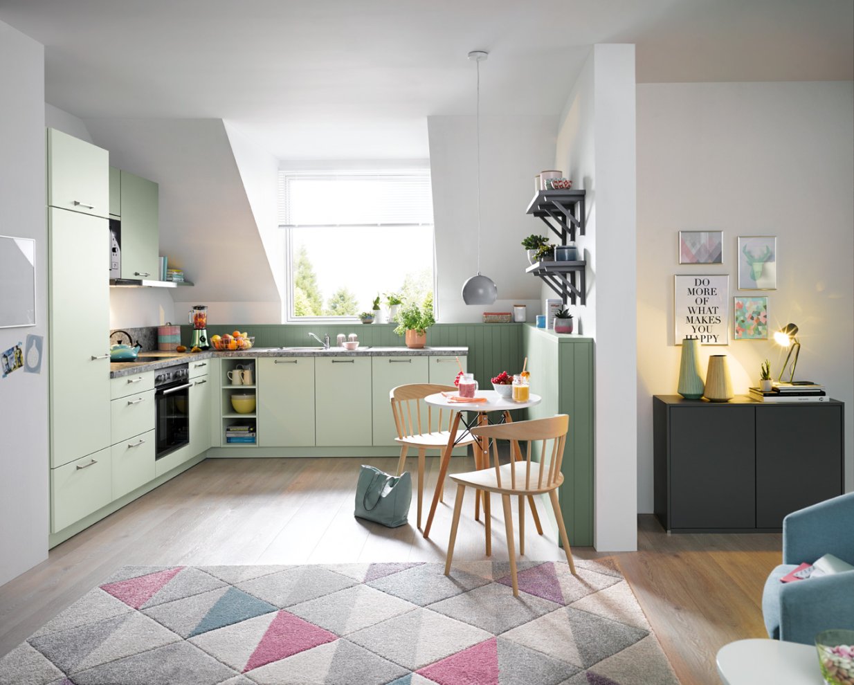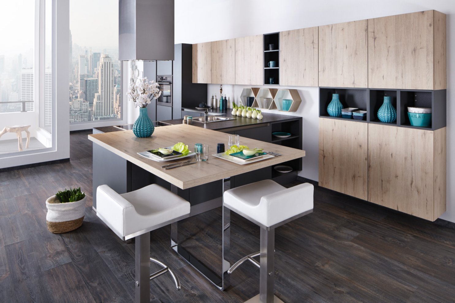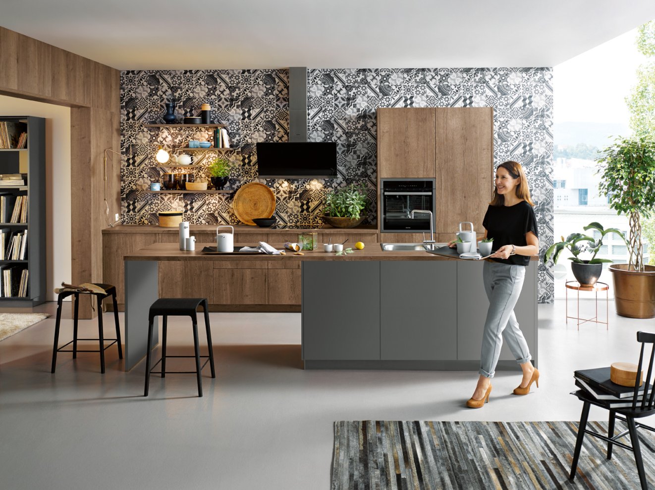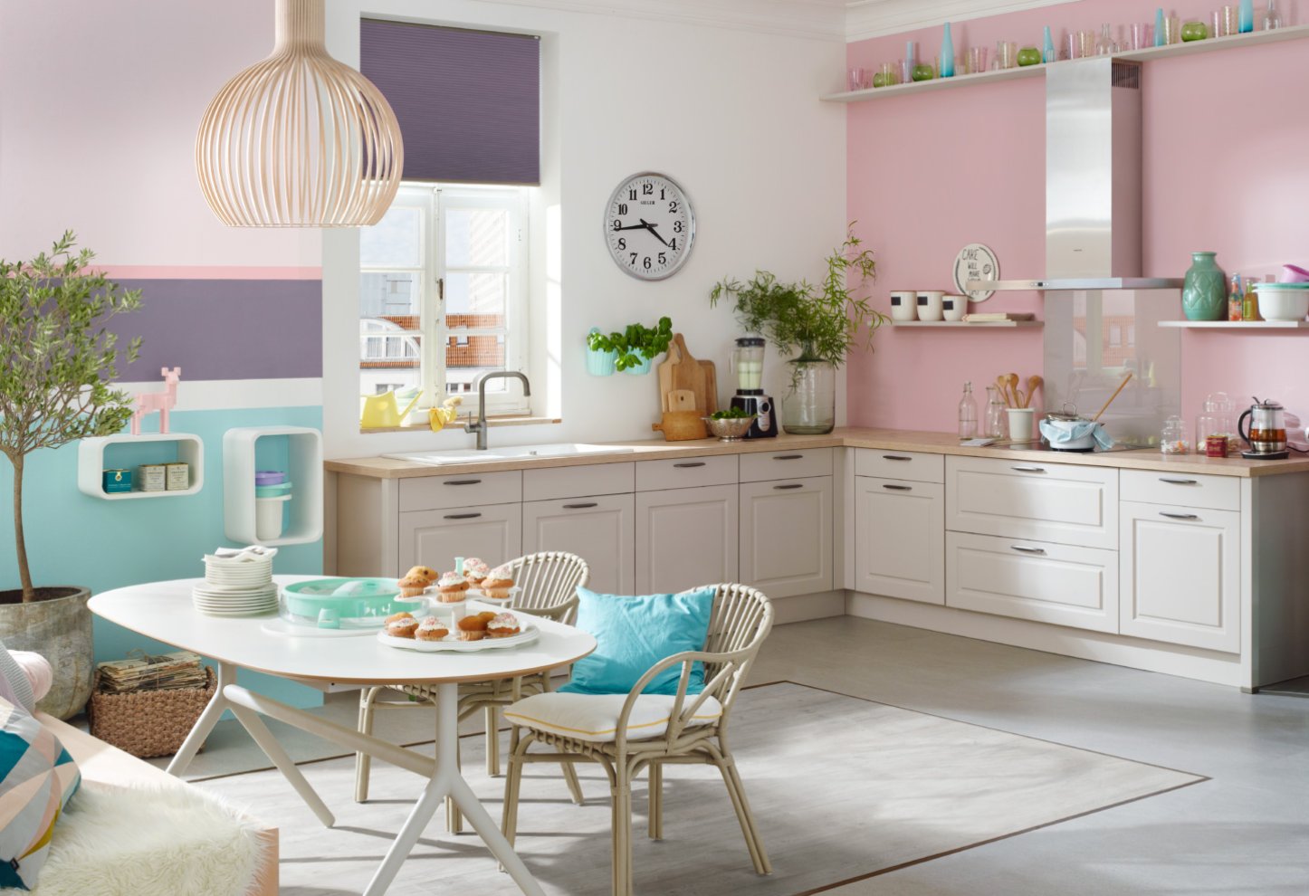 Sie ist ein Eyecatcher, der zudem vielfältige Aufgaben erfüllt: die Küchennische, der Raum zwischen der Arbeitsplatte und den Hängeschränken. Sie dient als attraktive Stellfläche für ausgewählte Lieblingsgegenstände des Küchenalltags – z. B. einen dekorativen Espressoautomaten oder Smoothie Maker. Selbstverständlich wird auch heute noch in vielen Küchen der Bereich zwischen Arbeitsplatte und Hängeschränke gefliest. Dabei wählt man allerdings eher Fliesen im großen Format, was vor allem den Vorteil hat, dass weniger Fugen entstehen und der Bereich leichter zu reinigen ist. Außerdem spricht nichts dagegen die Nische mit Stein, Mineralwerkstoff, Keramik, Tapeten oder Wandtattoos zu gestalten. Auch hier gilt wieder : Erlaubt ist was gefällt!