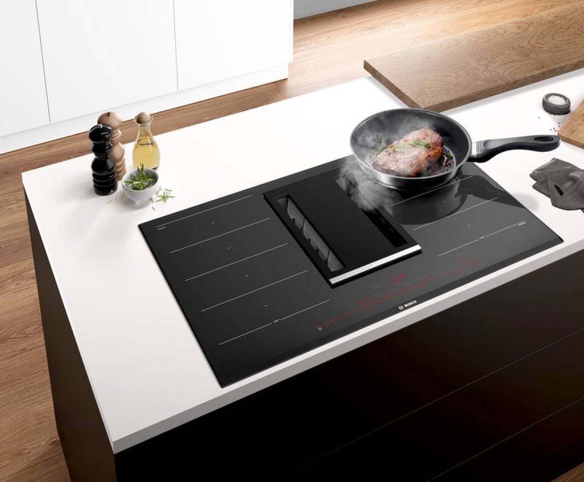Hier gibt es die klassische Wandhaube oder auch die Inselhaube in verschieden Formen und Designs. Als klassische Edelstahlhaube, als Schrägelement in Glas oder als Flachschirmhaube im einem Hängeschrank verbaut. Gerade in einer offenen Wohnküche mit Insellösung kann eine Haube das Gesamtbild stören. Viele Hersteller bieten deshalb inzwischen Muldenlüftungen an, die Gerüche genau dort einsaugen, wo sie entstehen. Alternativ dazu gibt es für Kochinseln auch Deckenlüfter. Diese werden entweder direkt unter die Decke gehängt oder sogar flächenbündig eingebaut, sind besonders unauffällig und platzsparend.